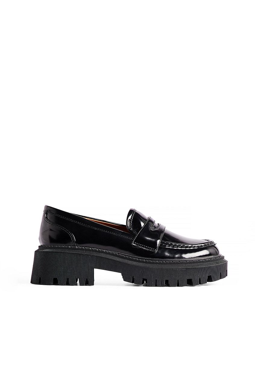 This loafer is shiny and made of PU and features a chunky sole. They have a rounded toe. Measurements in size 39: Sole height: 2,5 cm / 0.98. Heel height: 4,5 cm / 1.77 in. This loafer comes in black.