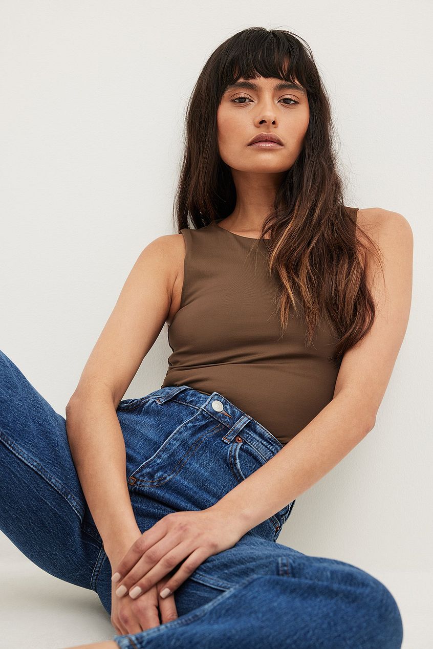 This body features a seamless design with a half lining. It has a stretchy material, a round neckline and a thong design with a snap button closure. This body comes in brown.