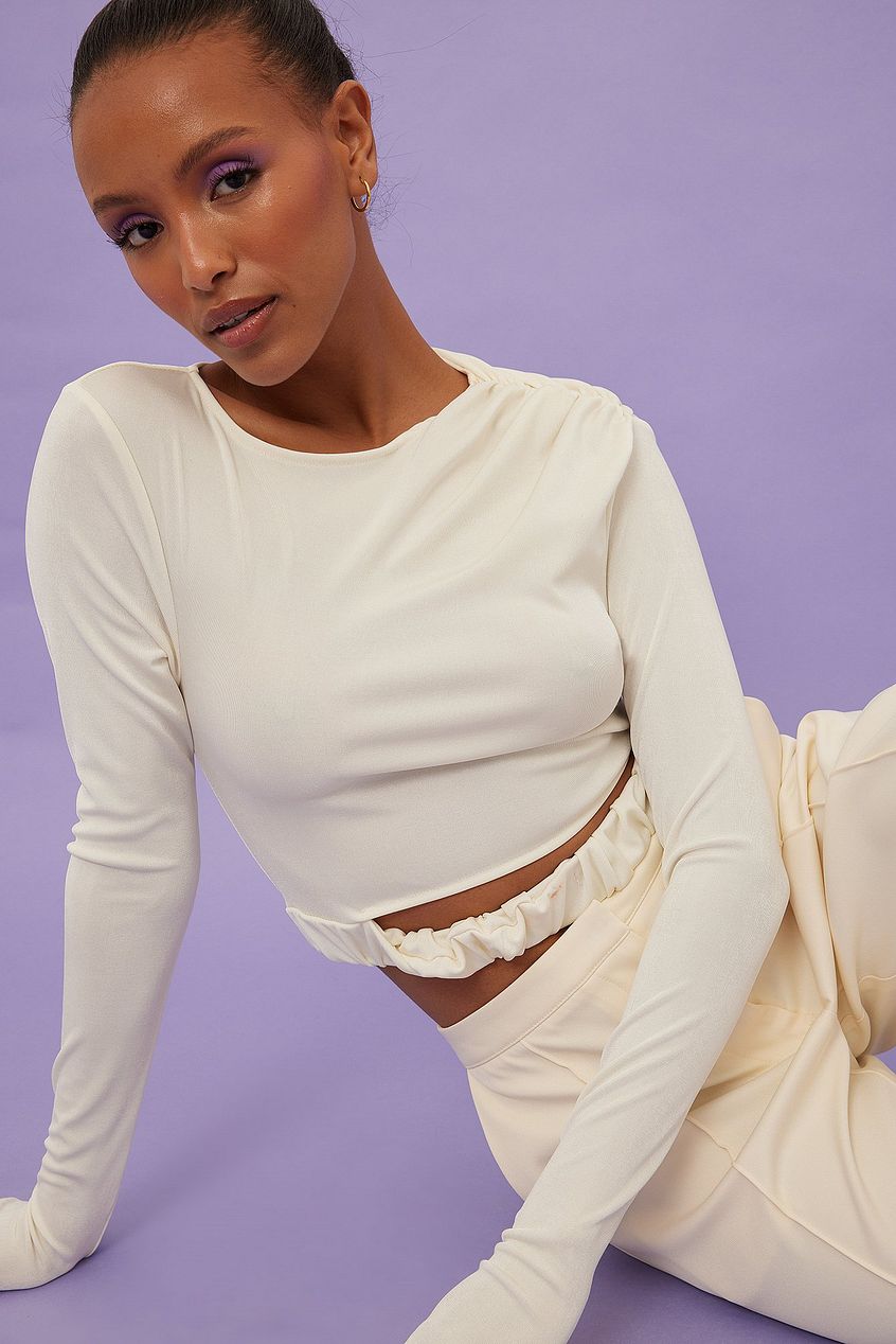 This top features a crew neckline, a draped shoulder detail, a long sleeve and an elasticized waist with a cut out detail. This top comes in off-white.