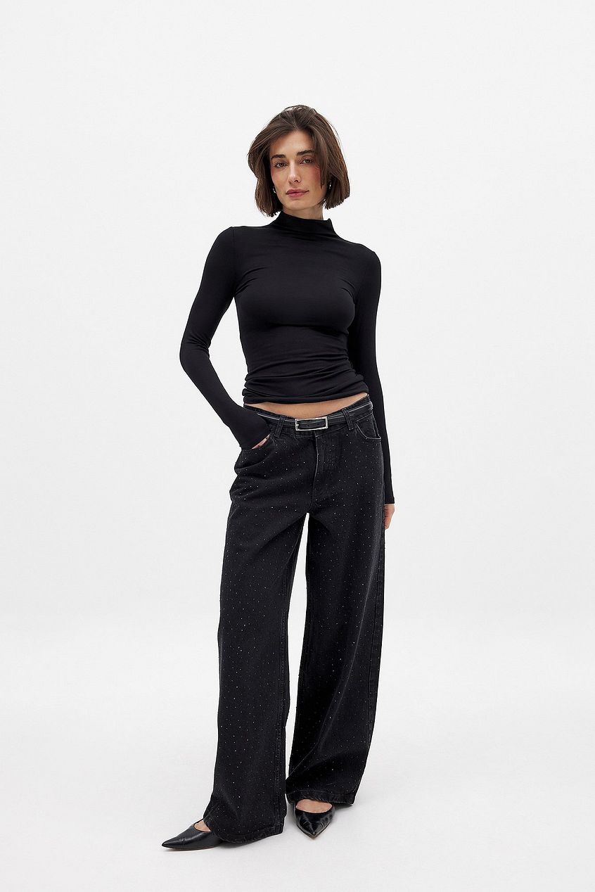 These jeans feature a loose fit and wide legs. They have rhinestone embellishments and a zipper and button closure. The color of this product may transfer to itself or other objects. Avoid making contact with light-colored surfaces. These jeans comes in black.