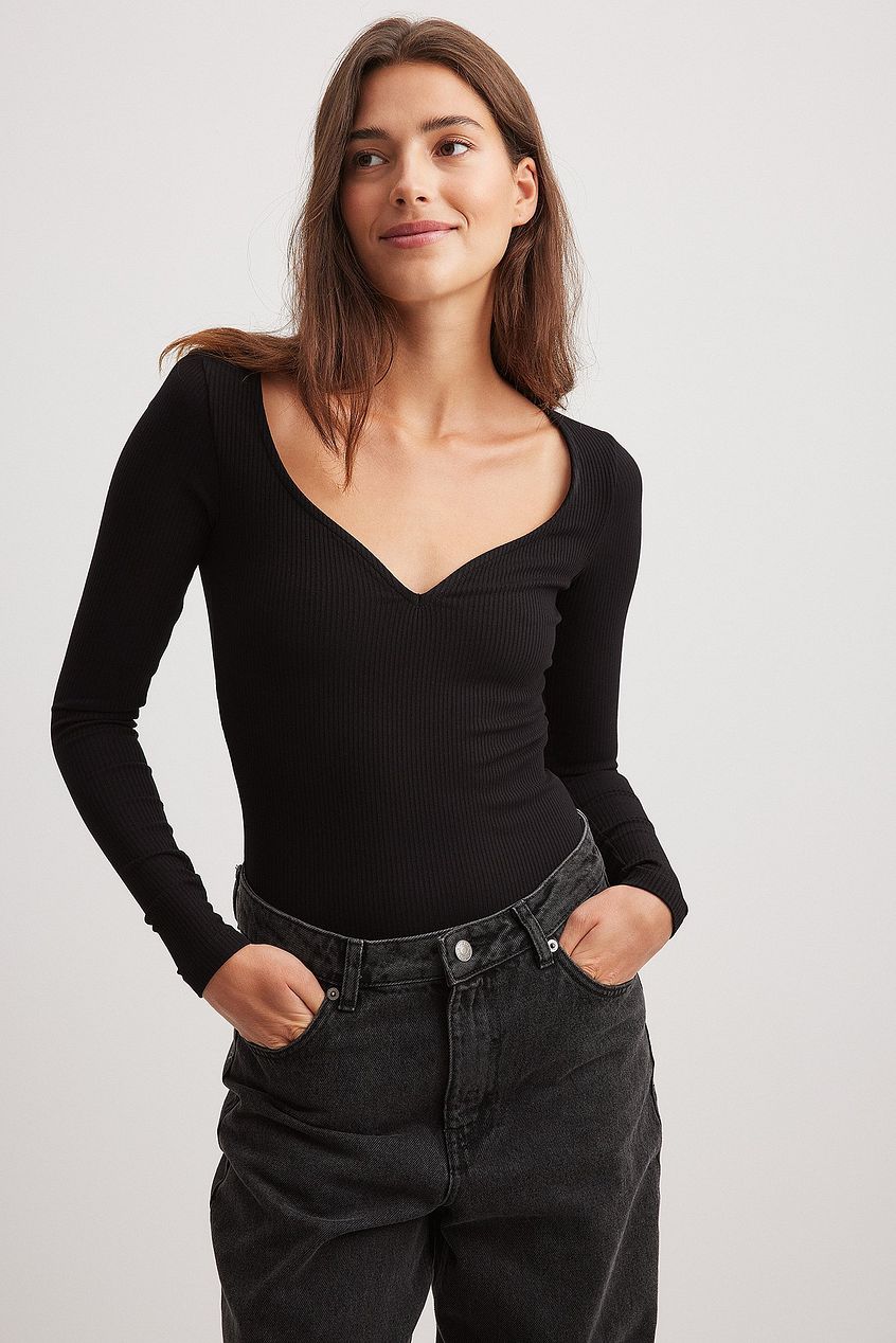This body features a ribbed stretchy material and a form fit. It has a heart-shaped neckline and long sleeves. Our body features a thong design with a snap fastener on the bottom. This body comes in black.