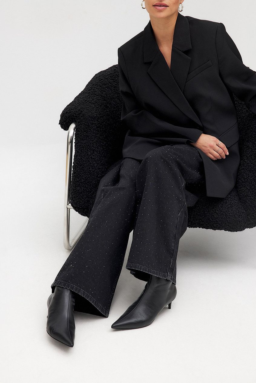These boots are ankle high and feature a pointed toe and a kitten heel. They have a zipper closure on the side. Measurements in size 39: Heel height: 5 cm / 1,9 in. Shaft height: 16 cm / 6 in. Shaft circumference around the calf: 27 cm / 10,5 in. These boots come in black.