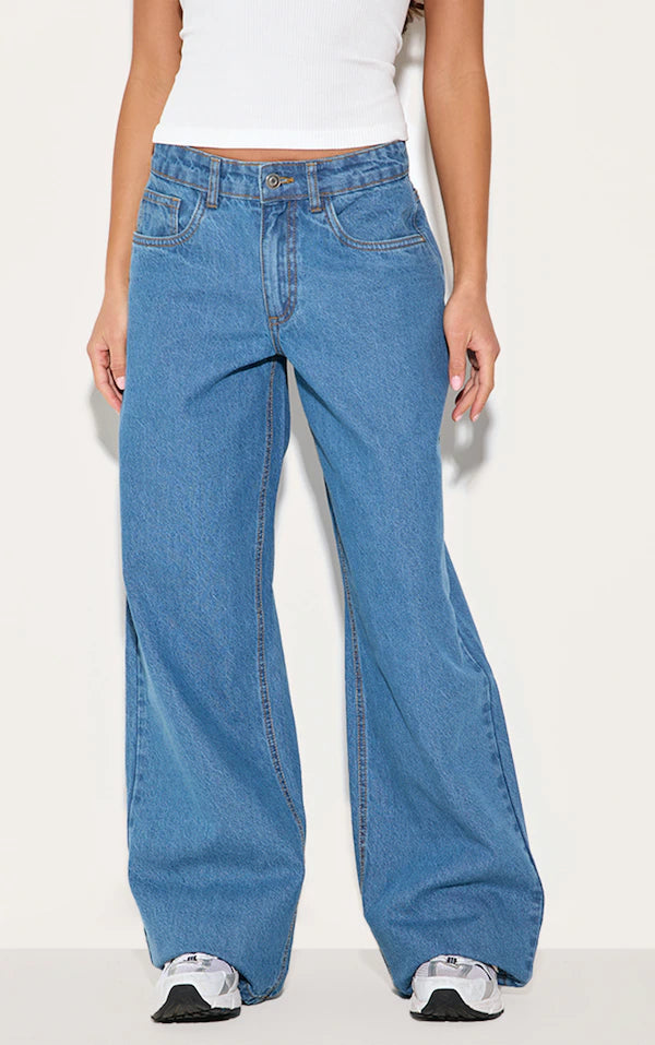 Mid Blue Wash Low Waist Wide Leg Jeans