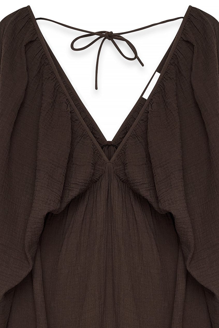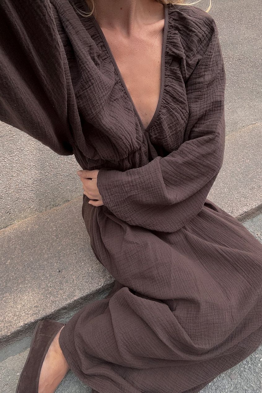 This dress features a flowy fit and a soft touch. It has a v neckline and balloon sleeves. The dress has an elastic waistband and a deep back with a self-tie knot. This dress comes in brown.