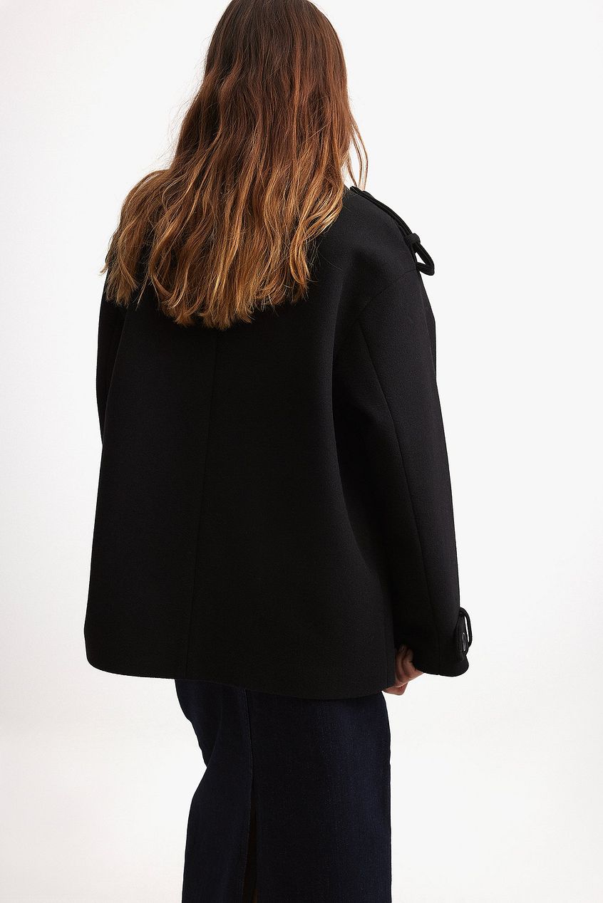 This coat features a short fit. It has a lapel design and a double-breasted button closure. The coat has welt front pockets and a buckle detail on the cuffs. This coat comes in black.
