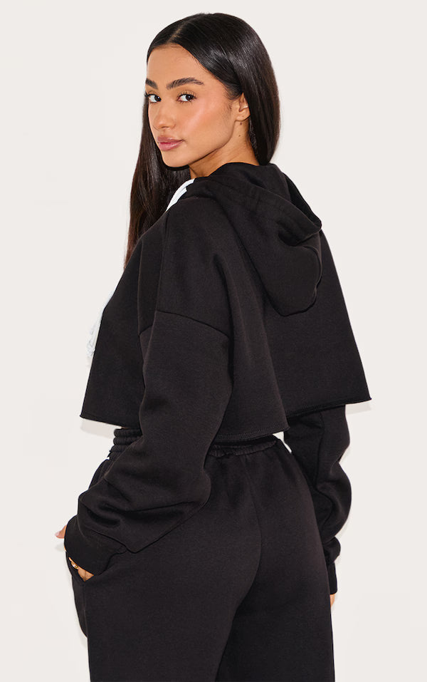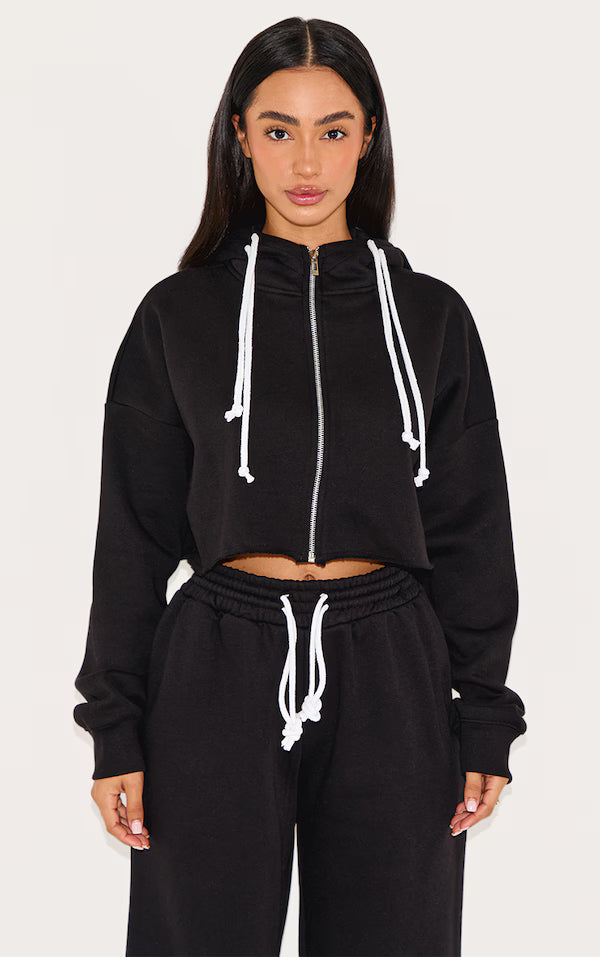 Refine your off-duty edit with this cropped hoodie, rendered in a classic black. The contrast drawstring adds a subtle point of interest to the relaxed silhouette, while the zip-up front allows for versatile styling. Crafted for comfort and ease, this piece is ideal layered over a simple tee. We suggest pairing it with high-waisted tailored trousers from our bottoms collection for an elevated take on casual cool.