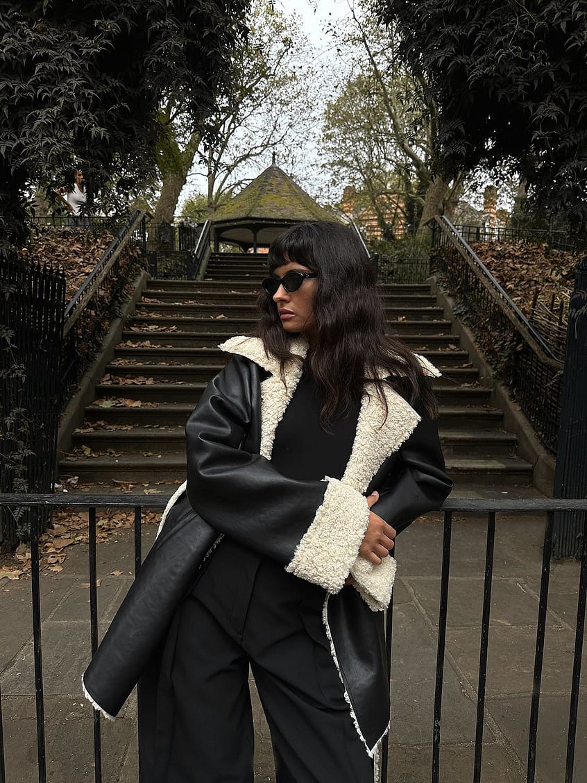This coat is made of PU and features a short fit and a teddy material on the inside. It has a wide lapel neckline and a self tie waist belt. Our coat features folded cuffs, welt side pockets and a double-breasted button design. This coat comes in black. Campaign model: The model is 175 cm tall and is wearing size EU 36 (UK 10, US 6, small).