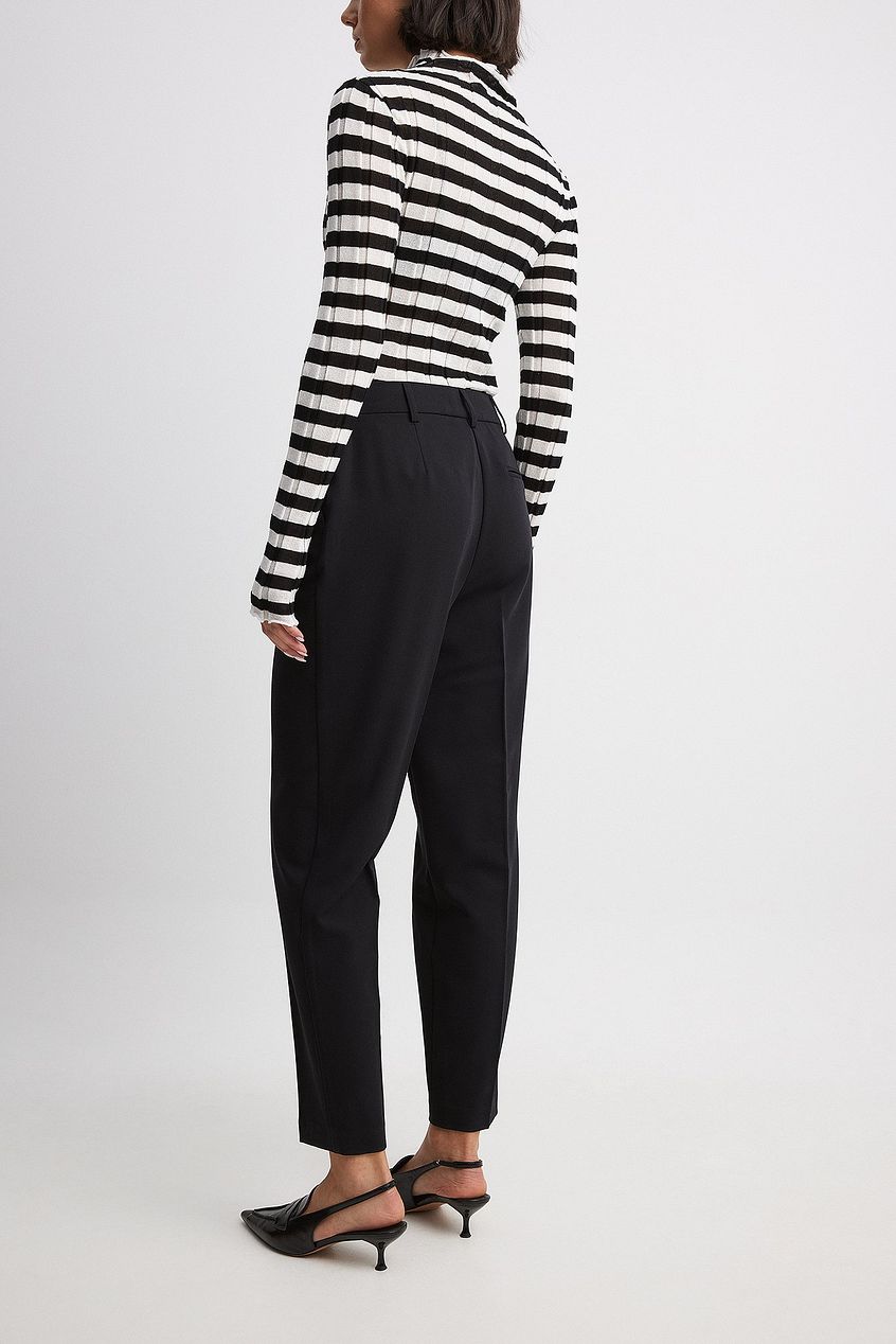 These suit pants are tailored and feature a high waist fit. They have side slant pockets and a back mock pocket. Our suit pants have cropped length. Inseam length in size 36: 70 cm / 27.55 in. These suit pants comes in black.