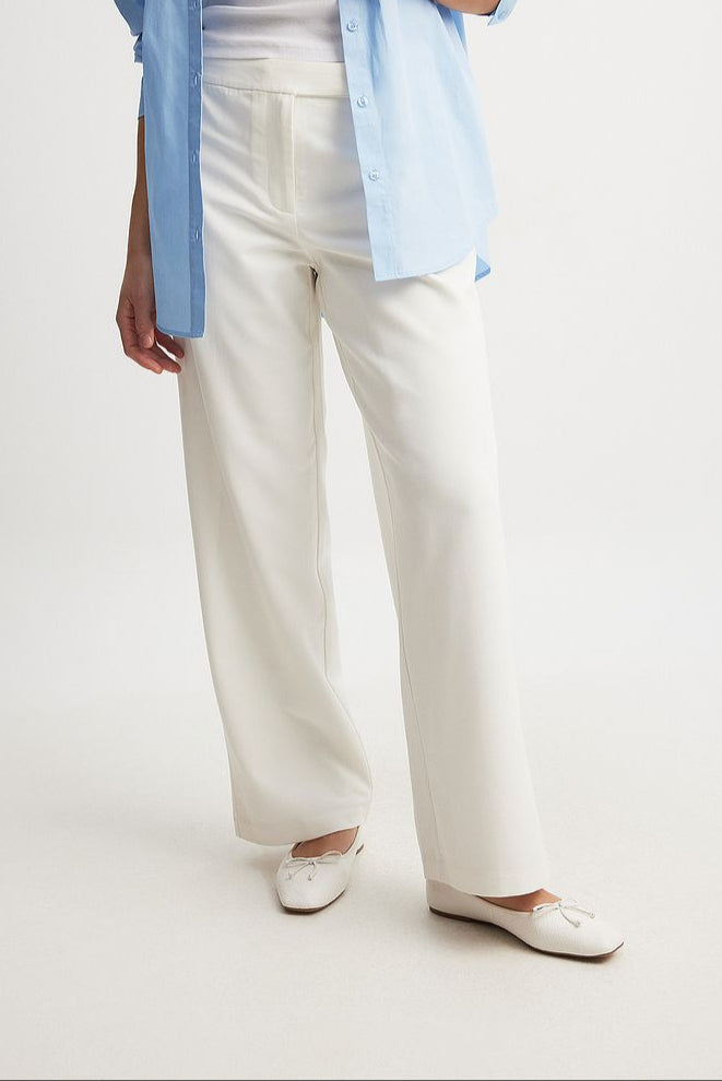 These suit pants feature a straight leg and a low waist. They have a concealed zipper, hook and button closure. These suit pants comes in bone-white.