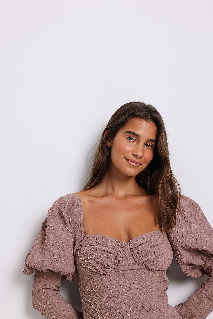 This mini dress features long sleeves with cut out details and puffy shoulders, ruched, soft cups, a hidden zipper on the side, a draped overlap design at the bottom half and underlining. This mini dress comes in purple.