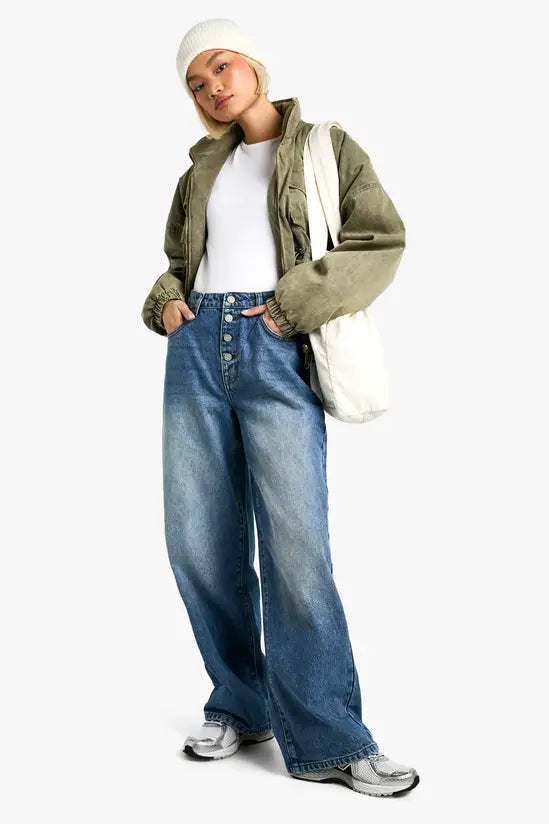 Make a statement with these eye-catching wide-leg jeans, featuring a distinctive button-fly detail that adds a touch of retro charm. The high-waisted design elongates your silhouette, while the rigid denim construction ensures a structured look that holds its shape throughout the day.
