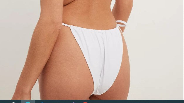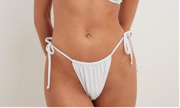 This bikini panty features swimsuit material and a high cut leg. It has a thin self tie drawstring waist closure on the sides. This bikini panty comes in white.