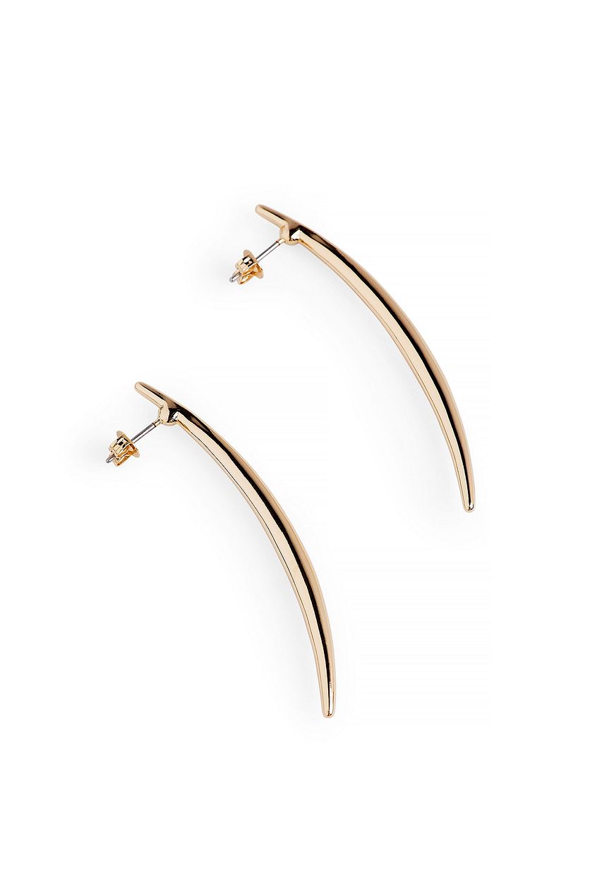 These earrings are pointed and feature a slightly curved shape. They have a press closure. These earrings come in gold-colored.