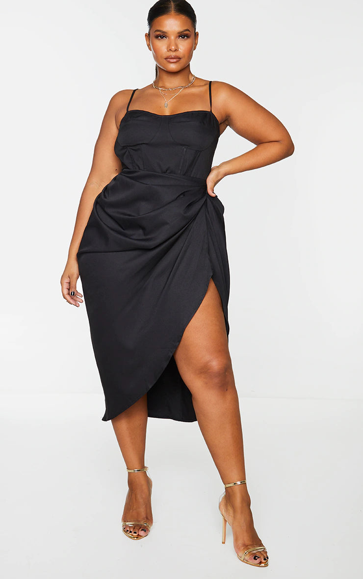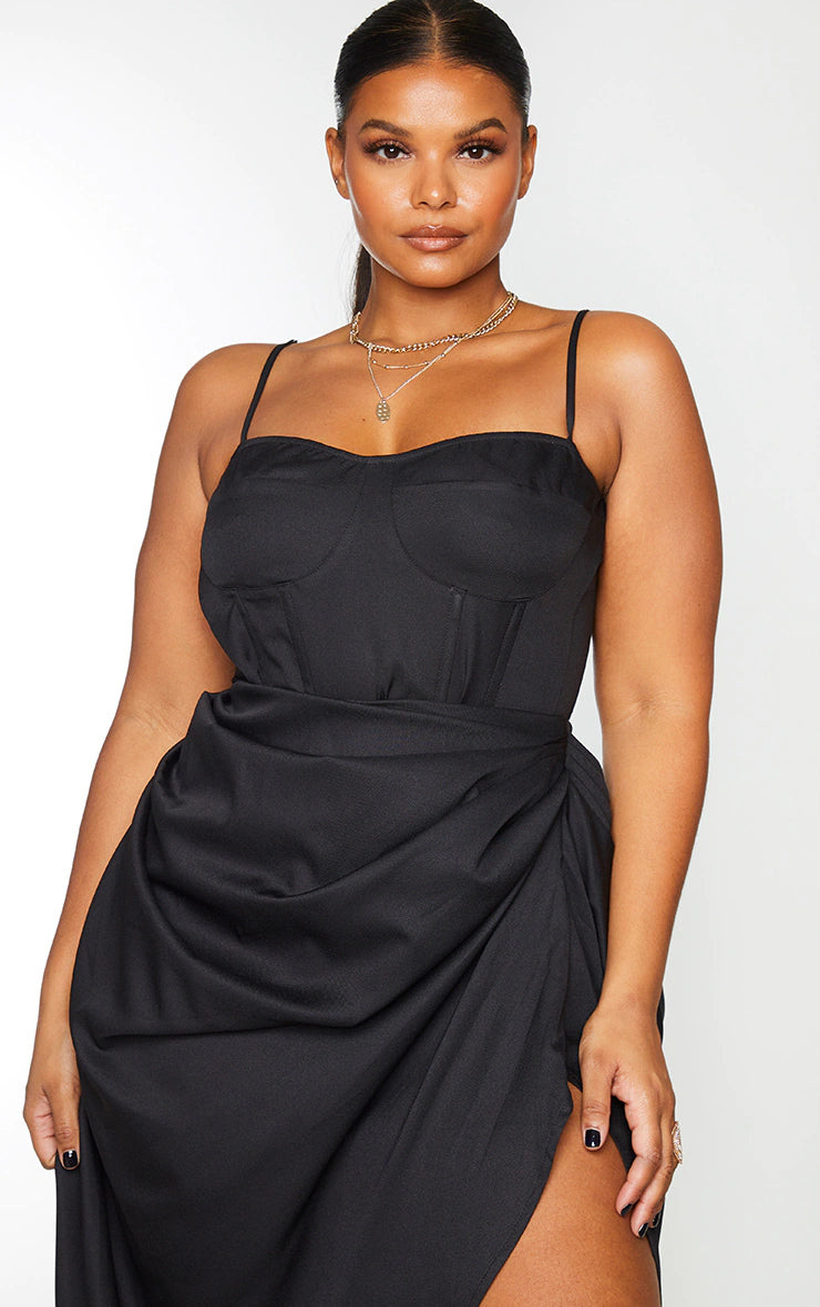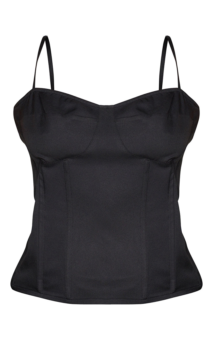 This top is a wardrobe essential and we are obsessed. Featuring a black material with a structured corset detail and thin shoulder straps. Team it with a matching ruched midi skirt and sky high heels for a fierce combo.