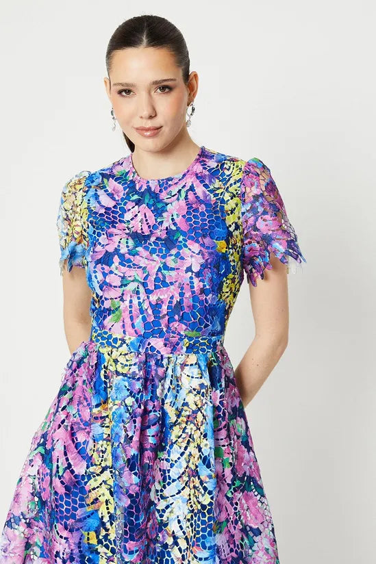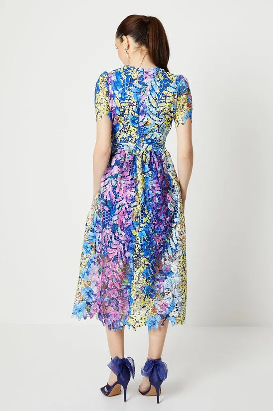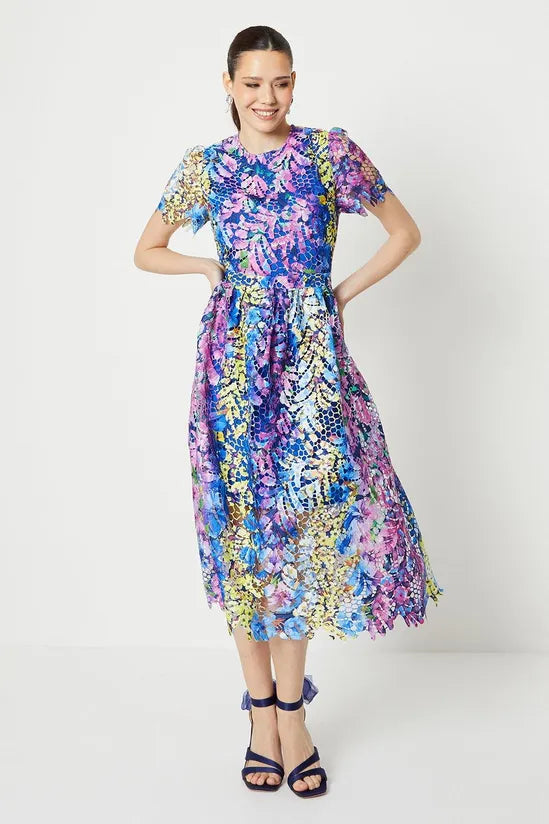 Crafted from lace, this midi dress exudes sophistication and elegance. The intricate floral print lends a touch of whimsy, while the A-line silhouette and midi length create a flattering, feminine silhouette. Sheer lace sleeves with scalloped trims add a delicate touch, making this dress perfect for formal occasions like weddings, races, or graduations. Style it with heeled sandals and a clutch for a polished, event-ready look that radiates refinement.