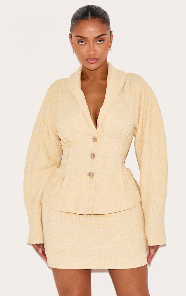 Brought to you in a vanilla premium material with a buckle cinched design, a cocoon sleeve and a hammered button detailing. Team this shape vanilla premium buckle cinched cocoon sleeve hammered button blazer with the matching skirt and a pair of court heels to elevate the look to new heights.